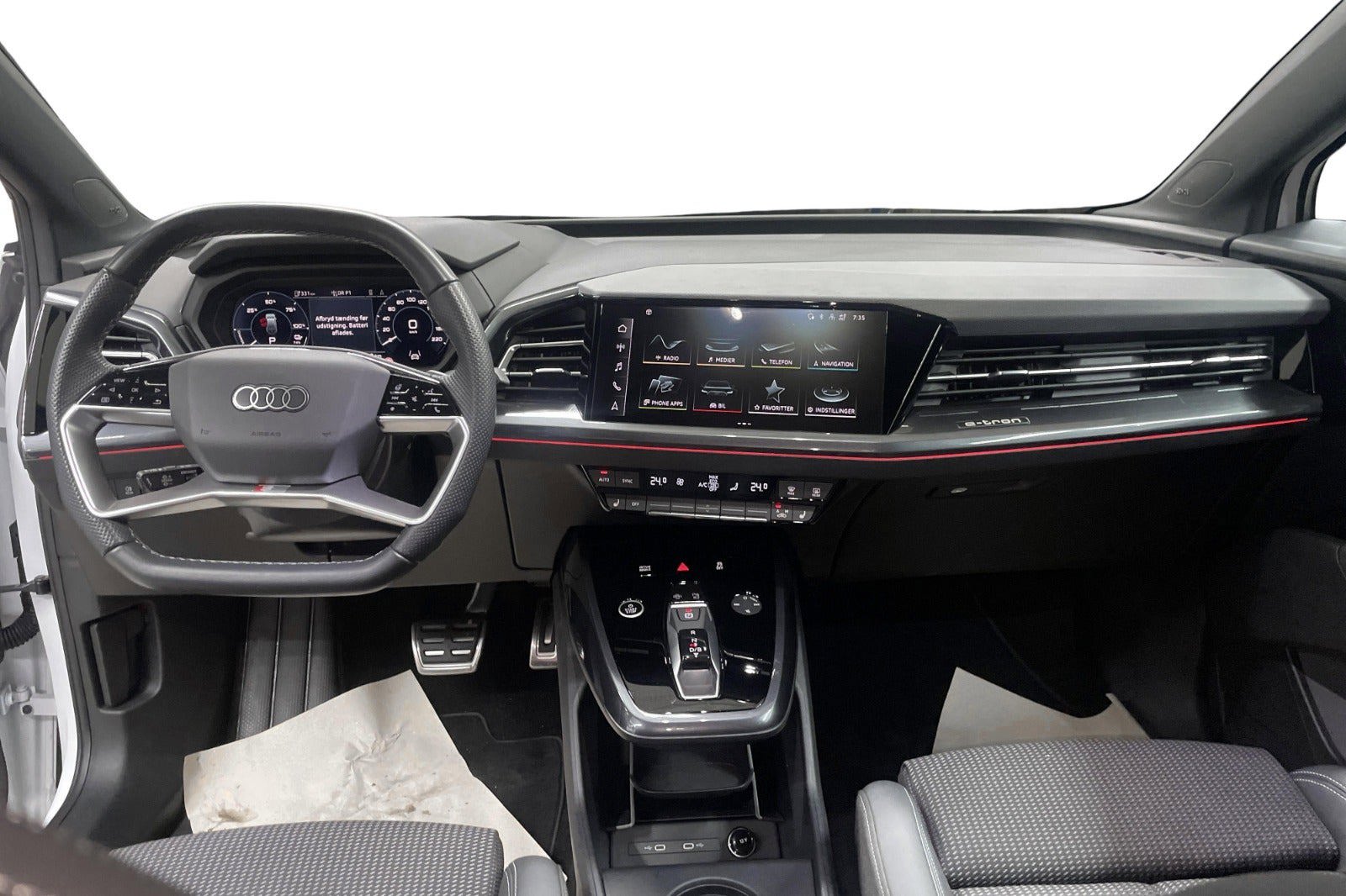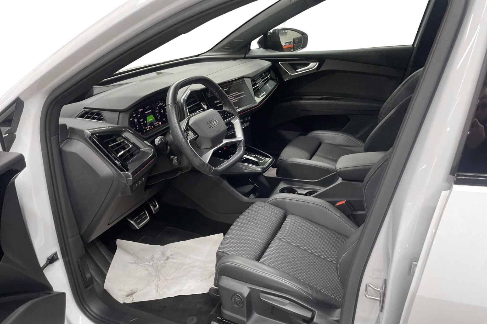 * Edition S-line, indeholder: - S-line interiørpakke - Nøglecover i sort højglans med ”Q4 e-tron”-modelbetegnelse - S line-stødfanger med bottom line i kontrastlakering i mythossort metallak hele vejen rundt - Udvendige S line-elementer med S line-logo på skærmene - Sportsundervogn - Tonede ruder - 21" Alufælge Audi Sport 5-W-eget stjernedesign, mat bronze, glanspolerede - Sort optikpakke plus - Tagræling i sort (kun SUV) - Sidespejlhuse i sort - Folierede Audi-ringe i bronze på C-stolpen (Kun ved mat bronze fælge) - Mørkttonede matrix-LED-forlygter m. forlygtesprinklere - Mørkttonet baglygtebånd med LED-baglygter - e-tron sportslyd