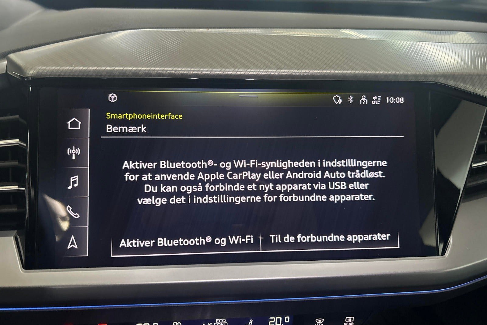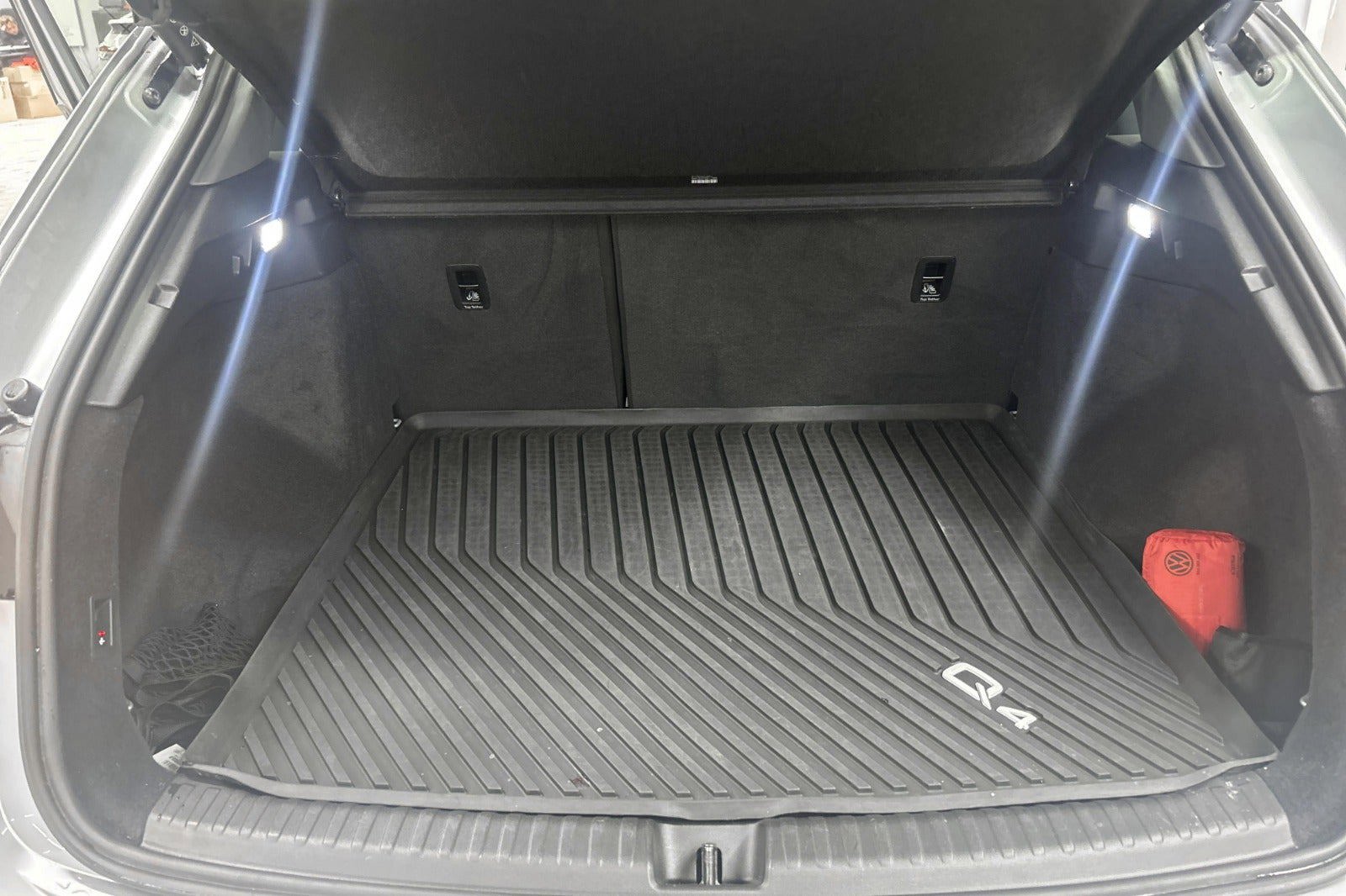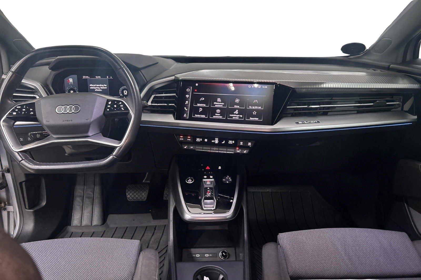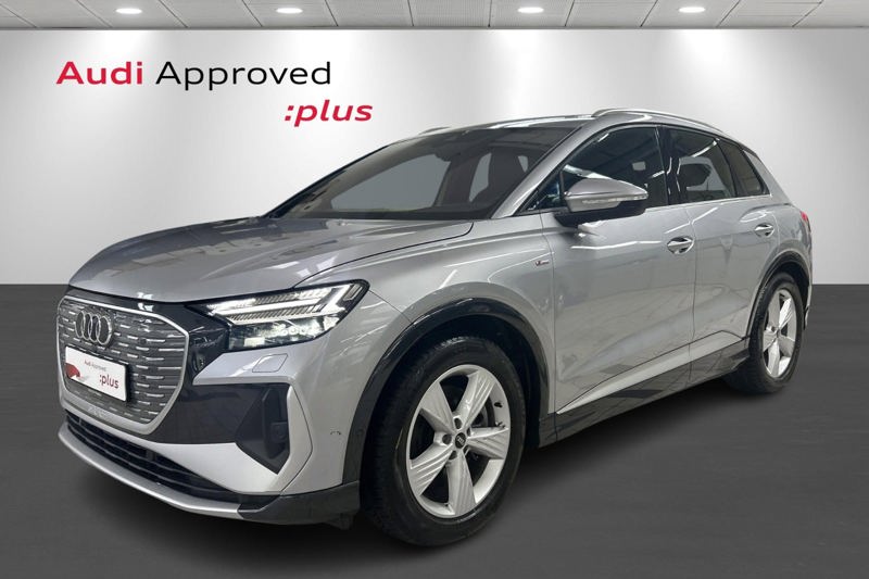 Udvalgt standardudstyr i Q4 e-tron: * Dansk bil med Varmepumpe * LED forlygter og baglygter * Undvigeassistent og drejeassistent * Komfortparkeringsklimafunktion * Klimaanlæg automatisk * Vognbaneafvigelsesadvarsel * Sædevarme foran * 19" alufælge 5-eget design * Audi pre sense front * Audi sound system * Børnesikring, elektrisk betjent * Børnesædefastgørelse i-Size i passagersiden og i-Size og * Top Tether på de yderste bagsædepladser * Dekorindlæg i sort eksklusiv lak * Digital radiomodtagelse * Digitalt cockpit 10,25” * Multifunktionssportslæderrat flad top og bund og skiftekontakter * Forsæder med højdeindstilling * Højglanspakke blanke rudelister * Komfortmidterarmlæn foran * Mode-3-ladekabel * Sidespejle med elektrisk indstilling, varme og indklapning, automatisk afblænding i begge sider * Sidespejlhuse i bilens farve * Splitbagsæde 40:60 * Tagræling blank
